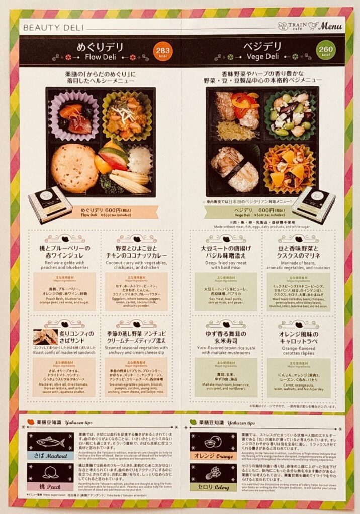 お客さまからの「駅弁以外に小腹を満たすような手軽に食べられる商品もほしい」というお声を受け、どのような商品を企画すべきか調査し、食に関心の高い女性のお客さまからは「美容・健康を意識したメニューが欲しい」という多くのご要望をいただき、そこを基点とし、社内外の女性スタッフが中心となり、企画した東北新幹線の車内販売限定の美容と健康を意識した「ビューティーデリ」。「アンチエイジングの黒デリ」(黒食材を使用した薬膳メニュー)と「リラックスのベジデリ」(日本初の車内販売のベジタリアン対応メニュー)の2種類。おつまみとしてもご好評をいただきました。 ※現在は販売終了