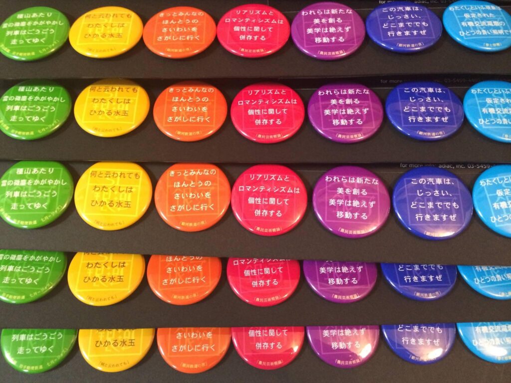 SL銀河(2014年から2023年までJR東日本釜石線を運行していた観光列車)の車内限定で、宮沢賢治の作品の一節が書かれた缶バッジ(作品の一節と作品名)をガチャガチャ(カプセルトイ)で販売いたしました。作品のテーマにより全7色に分類(自然、銀河、アート、愛、人生、光、青の賢治)し、全50種類、同じ缶バッジになるべくあたらないように設計しました。宮沢賢治の『銀河鉄道の夜』をテーマとしたSL銀河に乗車されたお客さまが、何か思い出にカタチとして持ち帰っていただきたいという想いと、宮沢賢治のよく知られた作品以外にも触れるきっかけになってもらいたいという想いを込めて、企画・プロデュースいたしました。 ※現在は販売終了