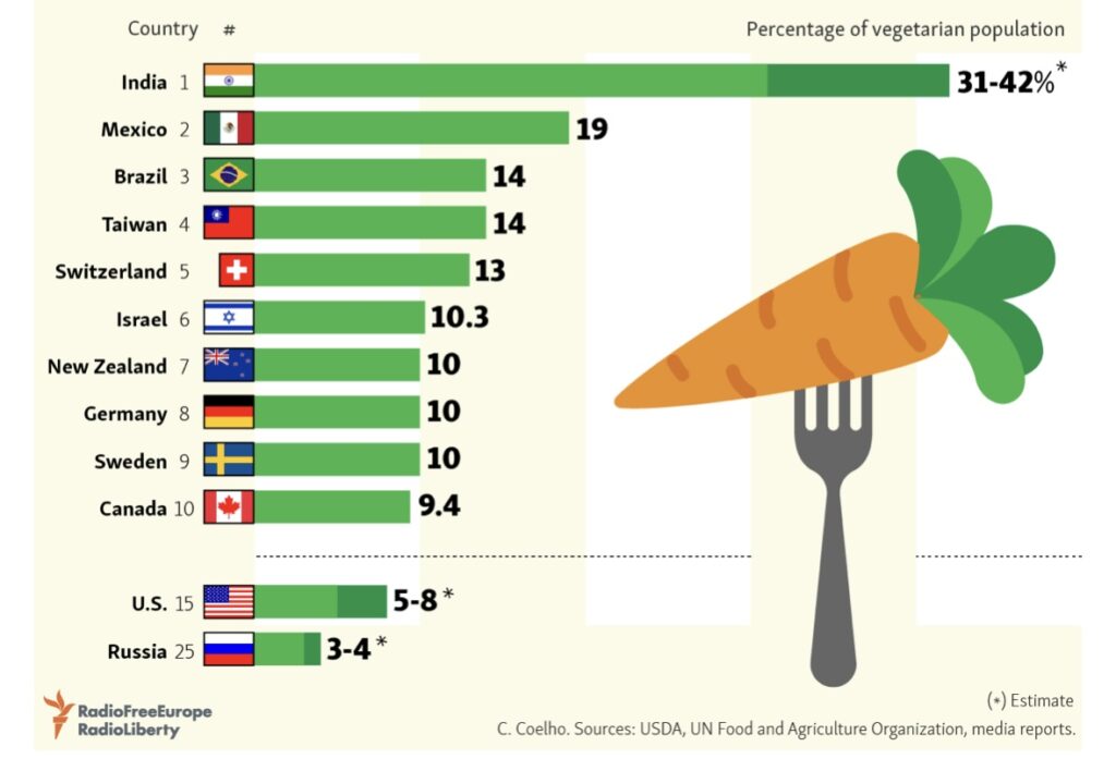 世界で最もベジタリアンの人口比率が高い国はインド。国民の約1/3強が「ベジタリアン」というデータがあります。2位のメキシコは10ポイント以上低い19%、次いでブラジルと台湾が14%でほぼ同率。イスラエル、ニュージーランド、ドイツ、スウェーデン、カナダが約10%、アメリカは5-8%(推計含む)。アジアで圧倒的にベジタリアンの割合が高いのは台湾で、「台湾素食」と呼ばれるベジタリアン食も歴史があります。インドや台湾は特に宗教的な理由が多いようです。日本は数万人規模のデータがないので何とも言えませんが、数千人程度の定量調査では3~5%程度という結果があります。